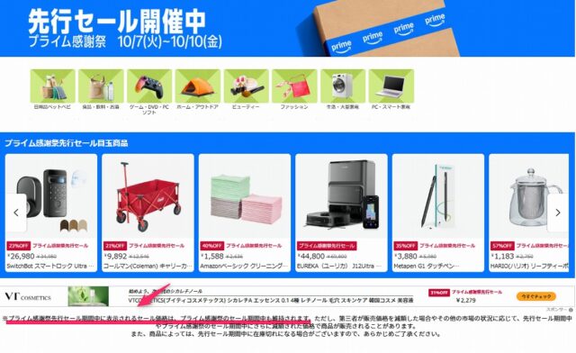 先行セールはプライム感謝祭の72時間前の10月4日(土)0時にスタート