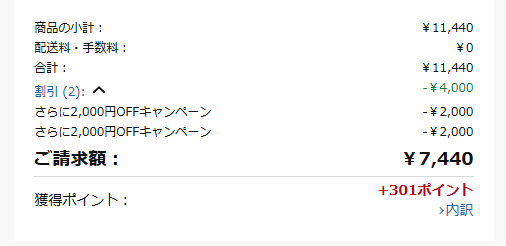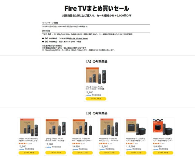 実はこのまとめ買いキャンペーンで、Fire TV Stick HD×1本とFire TV Stick 4K Select×2本をカートに入れると、2,000円引きが2回適応され計4,000円引きに!