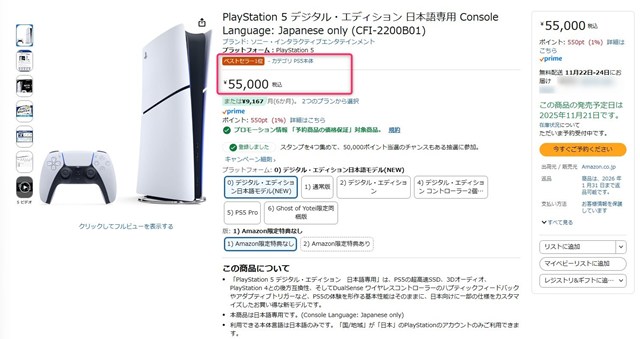 販売直後に購入できなかった場合は、在庫復活もあるため、11月19日の14時前後、16時前後に再度チェックしてみましょう。