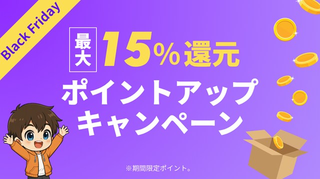 11月21日~12月1日のセール期間内に合計10,000円以上の買い物をすると、最大15%(上限10,000円分まで)のポイント還元がゲットできます。