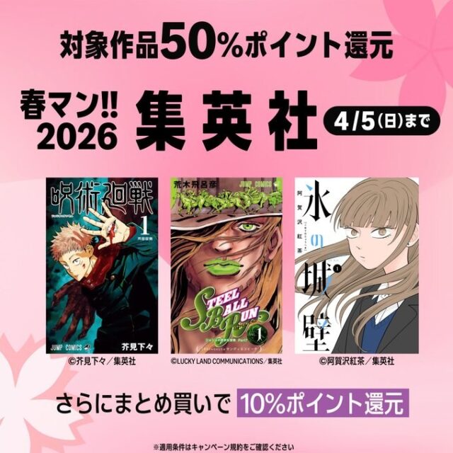 | 2025年3月31日~4月4日 | 集英社 春のマンガキャンペーン 50%P還元!まとめ買いでさらに+10% |