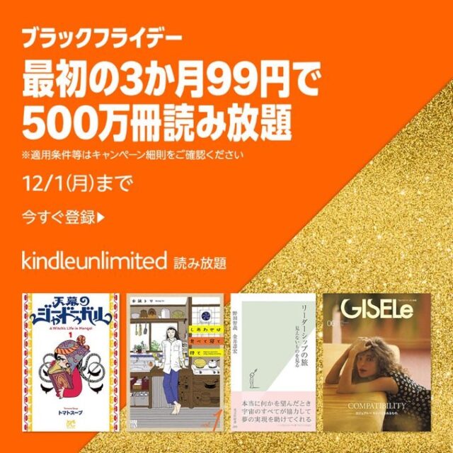 Amazonブラックフライデーにあわせて、Kindle unlimitedの3ヶ月99円キャンペーンがスタートしています。