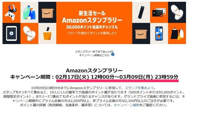 Amazonスタンプラリーの開催期間は、2/17~ 3/9です。