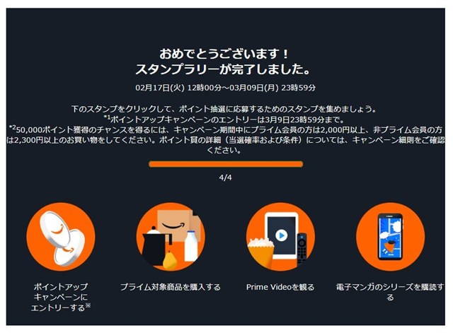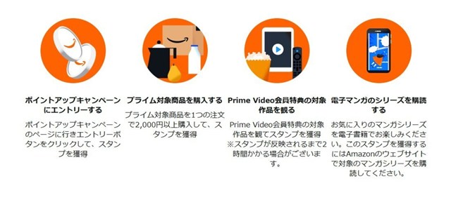 | スタンプの内容 | ①ポイントアップキャンペーンにエントリー ➁「✔Prime」対象商品を2,000円以上購入する ③Prime Videoを観る ④電子マンガのシリーズを購読する ※プライム非会員の場合 ①ポイントアップキャンペーンにエントリー ➁「✔Prime」対象商品を2,300円以上購入する ③Amazon MssterCardを申し込む ④電子マンガのシリーズを購読する |