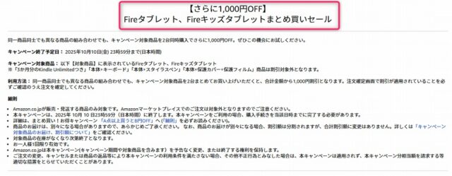 セールとなったFireタブレットを、さらに安く手に入れる方法は下記のとおり。