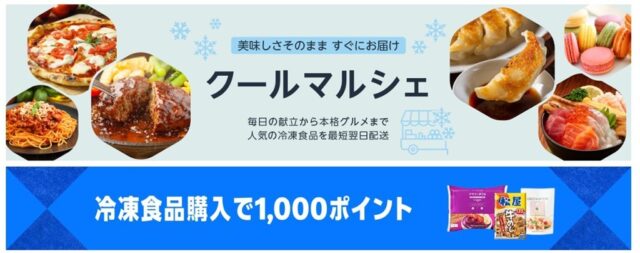 対象の冷凍食品を1回の5,000円以上購入で、1,000Pもらえるキャンペーンが開催されています。